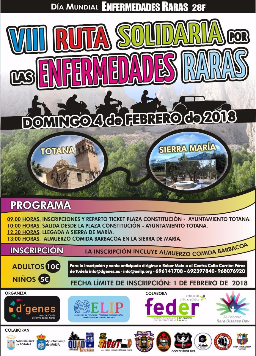 La Asociación de Enfermedades Raras D´Genes y la Asociación de Familiares y Afectados de Lipodistrofias (AELIP) han organizado la VIII Ruta Solidaria por las Enfermedades Raras, que tendrá lugar el próximo 4 de febrero entre el municipio murciano de Totana y el almeriense de María.