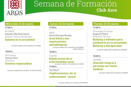 En estas jornadas se celebrarán diferentes sesiones sobre aspectos sanitarios o sociales como autismo, enfermedad visual, eventos responsables o bullyng, entre otros. Entre ellas, el jueves 22 de marzo a las 18:00 horas D´Genes expondrá el estado actual de las enfermedades raras. La sesión contará con una inscripción solidaria de 20 euros a beneficio de D´Genes.