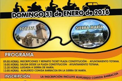 El programa de la jornada se iniciará a las nueve de la mañana con las inscripciones y reparto de los tickets en la Plaza de la Constitución de Totana. La ruta partirá a las diez de la mañana desde ese mismo emplazamiento y la llegada a Sierra de María está prevista alrededor de las 12:30 horas. Posteriormente, a las 13:00 horas tendrá lugar un almuerzo comida barbacoa en la Sierra de María.