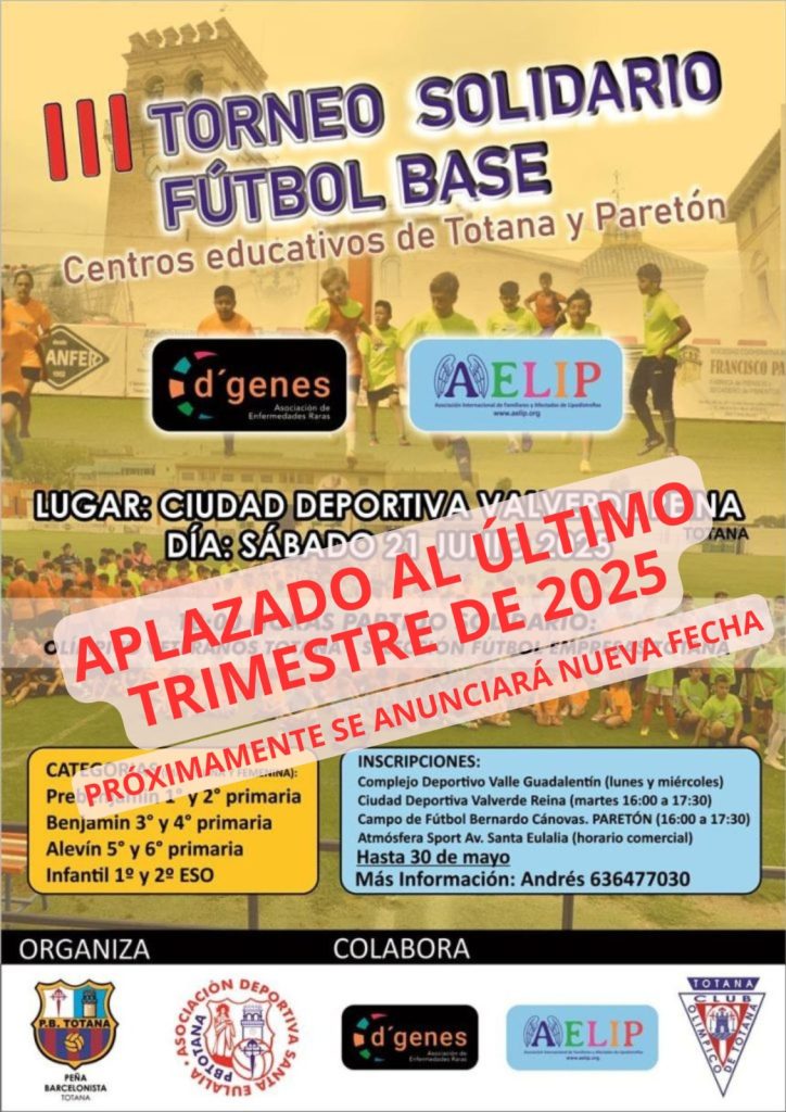El III Torneo Solidario de Fútbol Base de Centros Educativos de Totana y Paretón, que estaba previsto que se celebrara el próximo 21 de junio en la Ciudad Deportiva Valverde Reina de Totana, ha quedado aplazado.