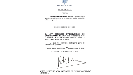 Su Majestad la Reina Doña Letizia ha aceptado la Presidencia de Honor del XV Congreso Internacional de Enfermedades Raras, que se celebrará los días 3 y 4 de noviembre en Murcia y también de manera on line