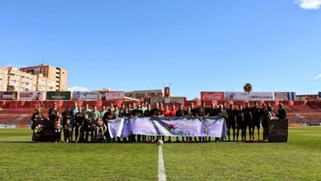 Miembros de la asociación se fotografiaron al inicio del encuentro con los jugadores, en una actividad que sirvió para dar visibilidad y sensibilizar sobre la realidad de las enfermedades raras