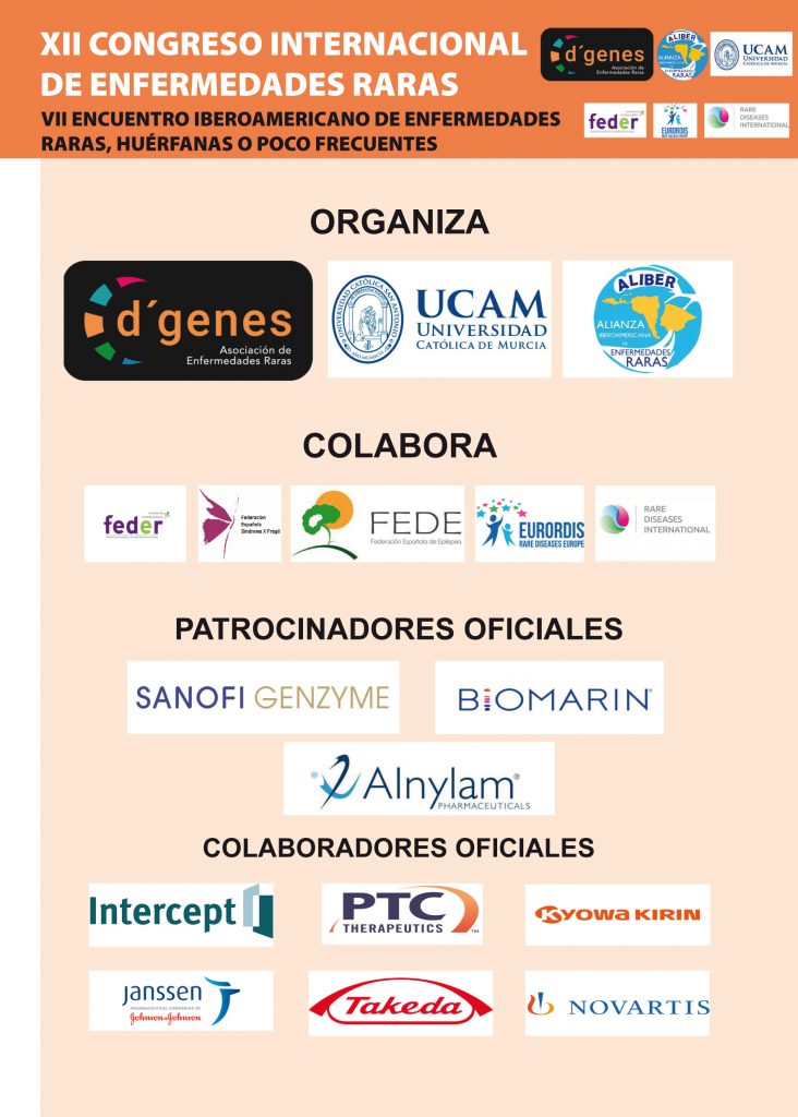 La Asociación de Enfermedades Raras D´Genes quiere agradecer a las diferentes entidades y empresas que han colaborad o patrocinanado el XII Congreso Internacional de Enfermedades Raras que se ha celebrado los días 15 y 16 de noviembre en Murcia, organizado por esta entidad con la colaboración de la Alianza Iberoamericana de Enfermedades Raras (ALIBER) y la Universidad Católica San Antonio de Murcia (UCAM).