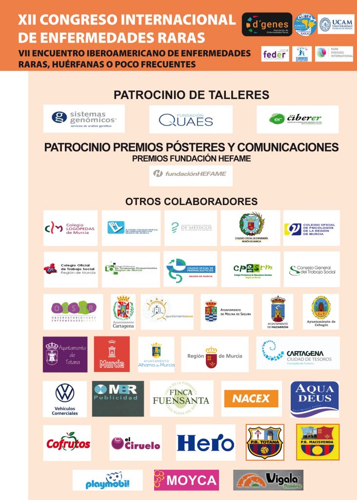 Sanofi Genzyme, Biomarín, Alnylam Pharmaceuticals, Intercept, PTC Therapeutics, Janssen, Takeda, Kyowa Kirin y Novartis han sido las entidades patrocinadoras y colaboradoras oficiales de esta duodécima edición del Congreso Internacional de Enfermedades Raras, mientras que Sistemas Genómicos Servicios de análisis genético, Fundación Quaes y CIBERER han patrocinado los talleres. Igualmente se agradece a la Fundación Hefame su colaboración en el patrocinio de los Premios a pósteres y comunicaciones orales.También se quiere agradecer a Playmobil y a Vehículos comerciales Wolkswagen su apoyo y colaboración. A todos ellos D´Genes agradece su contribución.
