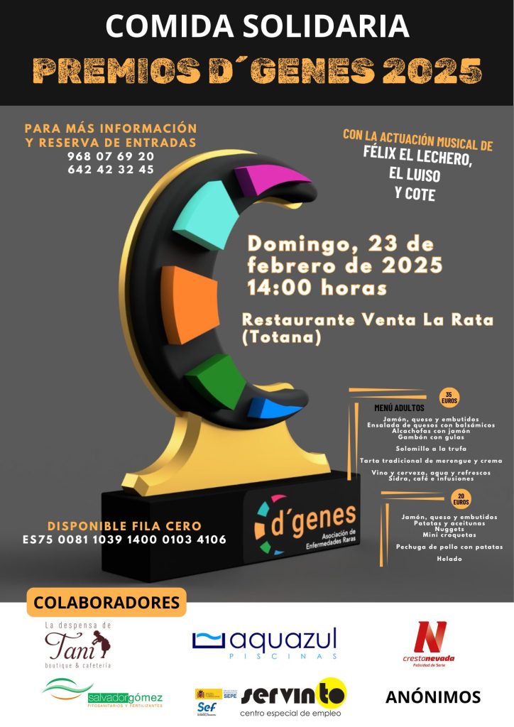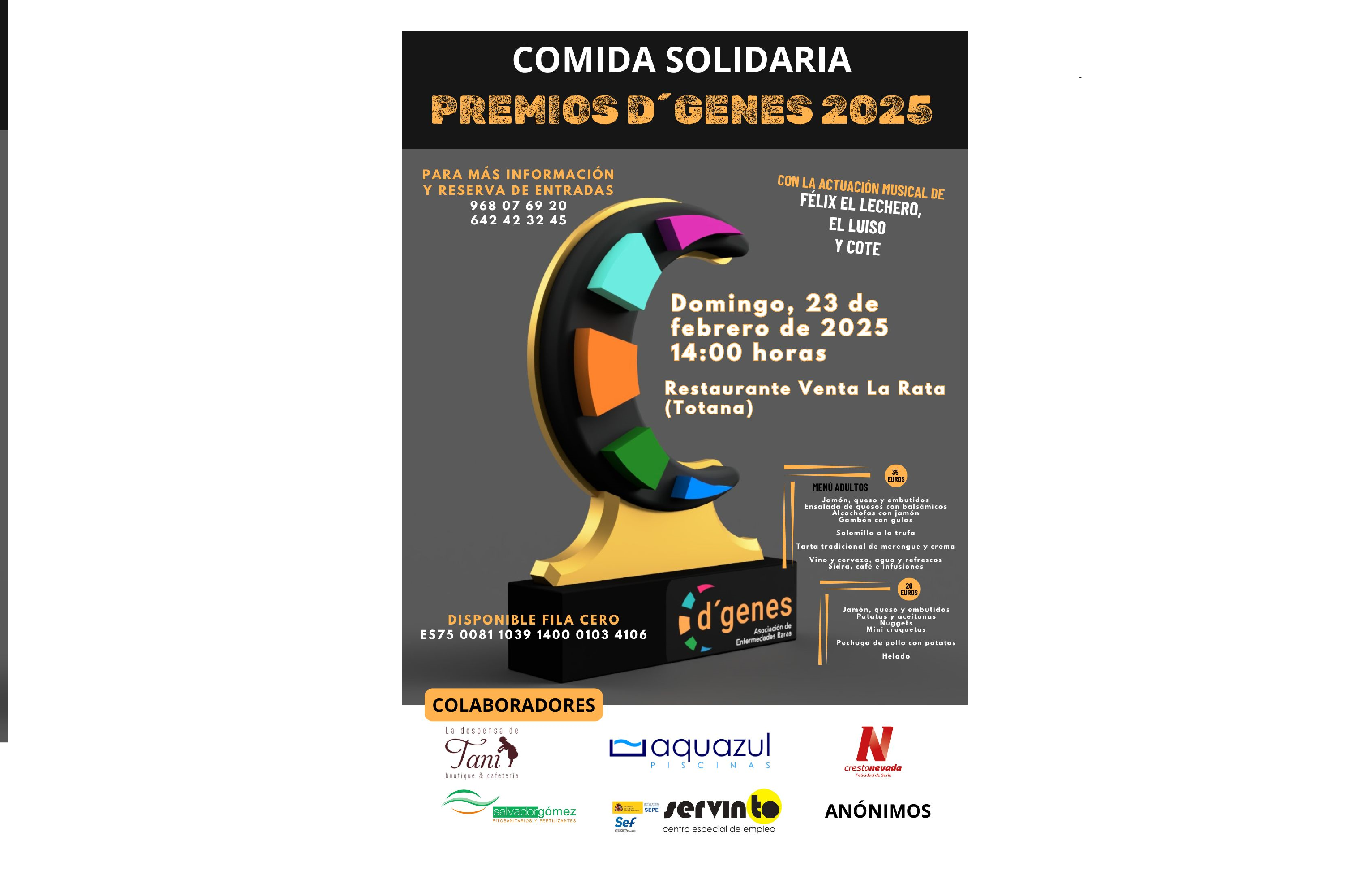 La Asociación de Enfermedades Raras D´Genes entrega el día 23 de febrero sus Premios 2025 en el transcurso de una comida solidaria que tendrá lugar a las 14:00 horas en el Restaurante Venta La Rata de Totana.