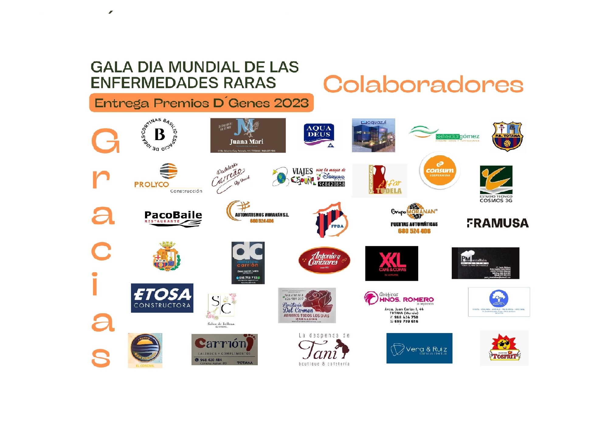 La Asociación de Enfermedades Raras D´Genes quiere agradecer a todas las empresas y entidades que han colaborado con la Comida Solidaria Día Mundial de las Enfermedades Raras organizada en Totana y durante la que tendrá lugar la entrega de Premios D´Genes 2023.
