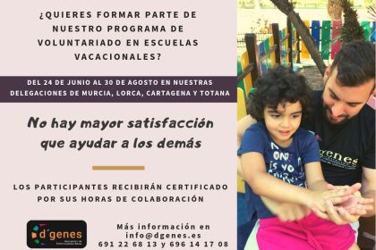 Entre otras actividades, D´Genes necesita voluntarios para las escuelas de verano de Murcia, Lorca, Cartagena y Totana, que se llevarán a cabo los meses de julio y agosto con una programación inclusiva adaptada a los perfiles de los participantes.
