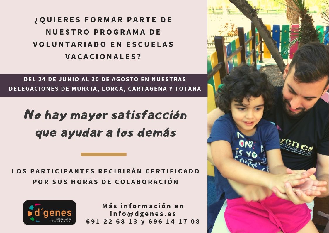 La Asociación de Enfermedades Raras D´Genes busca voluntarios para colaborar en diferentes actividades que desarrolla la entidad, en especial en el programa de escuelas vacacionales. Por ello, anima a aquellas personas que quieran colaborar a que se informen en la entidad.