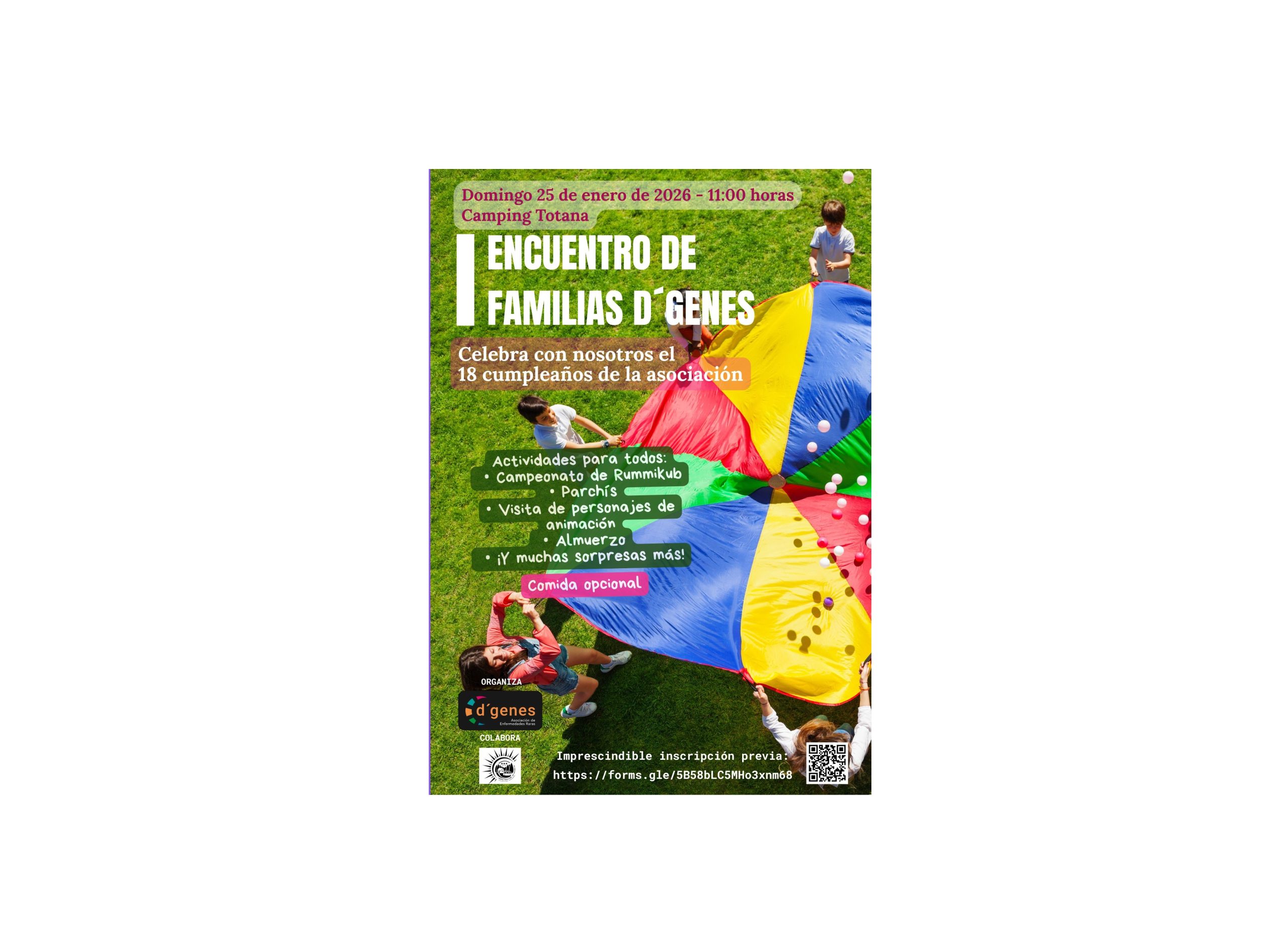D´Genes anima a socios y usuarios de la entidad a sumarse a esta jornada de convivencia. Para participar es imprescindible inscripción previa antes del jueves 22 de enero (indicando número de participantes), que se puede formalizar en el siguiente enlace: https://forms.gle/5B58bLC5MHo3xnm68
