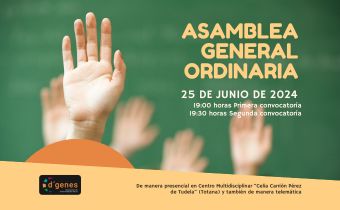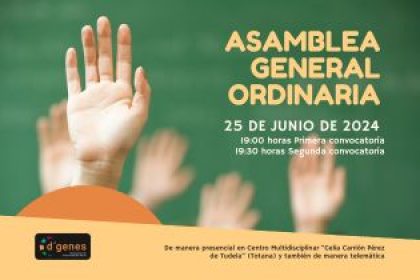 La Asociación de Enfermedades Raras D´Genes celebrará su Asamblea General Ordinaria el próximo 25 de junio de 2024 en el Centro Multidisciplinar “Celia Carrión Pérez de Tudela”, ubicado en el número 7 de la la calle San Cristóbal de Totana, a las 19,00 horas en primera convocatoria y a las 19,30 horas en segunda convocatoria, con el siguiente orden del día: