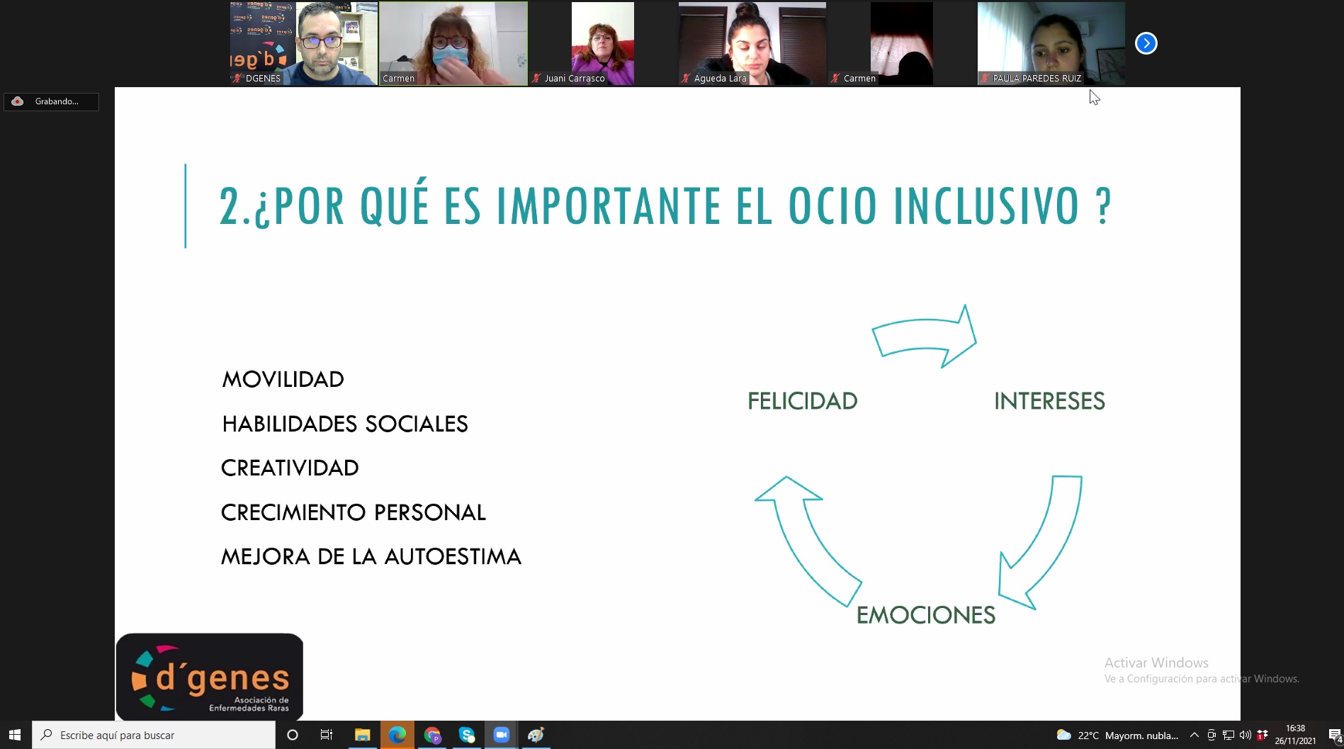 Esta última charla, que tuvo lugar en la tarde del viernes 26 de noviembre, versó sobre ocio inclusivo y enfermedades raras. Durante la misma intervinieron el responsable del área de Voluntariado de la entidad, Pedro Tudela, y la de Ocio, Carmen Soler, quienes dieron unas pinceladas sobre la importancia del ocio inclusivo, dinamización de grupos, etc.