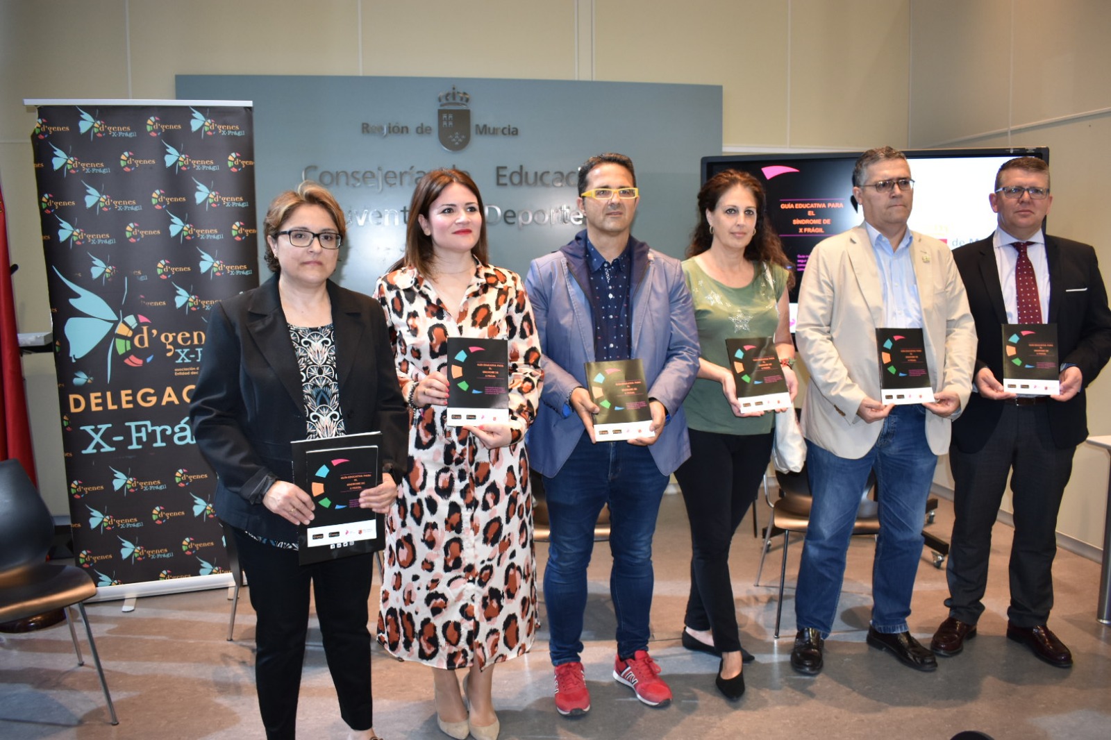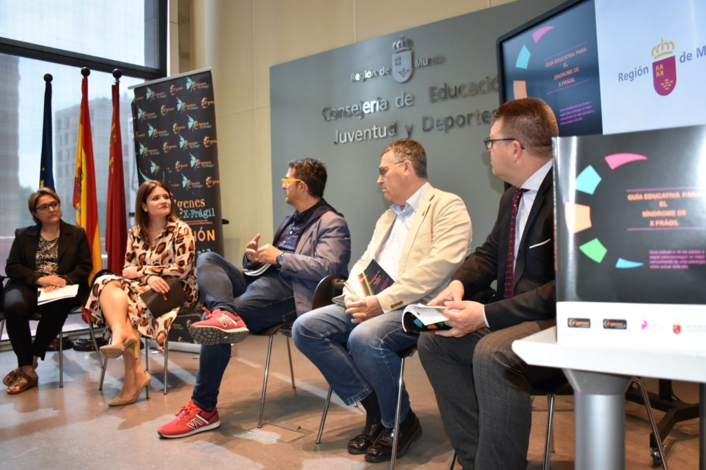 La Asociación de Enfermedades Raras D´Genes ha editado, en colaboración con la Consejería de Educación, Juventud y Deportes, una guía escolar sobre el Síndrome X Frágil para favorecer la inclusión de los alumnos que padecen esta enfermedad. La secretaria general de la Consejería de Educación, Juventud y Deportes, Esperanza Moreno, presentó hoy el documento junto al presidente de la asociación, Juan Carrión, y la autora del trabajo, Encarna Bañóm, y explicó que “constituye un ejemplo de los instrumentos necesarios para lograr la integración de todo tipo de alumnado y conseguir que nuestros centros sean lugares de completa inclusión”. La presentación también ha contado con la asistencia del director general de Atención a la Diversidad y Calidad Educativa, Francisco Martínez Casanova; el directivo de D´Genes Diego Bernal; y miembros de familias de D´Genes X Frágil.
