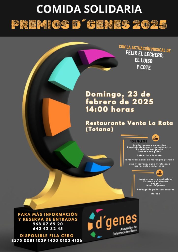 La Asociación de Enfermedades Raras D´Genes celebrará el próximo 23 de febrero su gala anual por el Día Mundial de las Enfermedades Raras, en el transcurso de la cual se entregarán además los Premios D´Genes, con los que la asociación distinguirá a personas, empresas, colectivos o instituciones que han aportado su granito de arena para mejorar la calidad de vida del colectivo de personas con enfermedades raras o han colaborado y contribuido a difundir y dar visibilidad a la realidad del mismo.