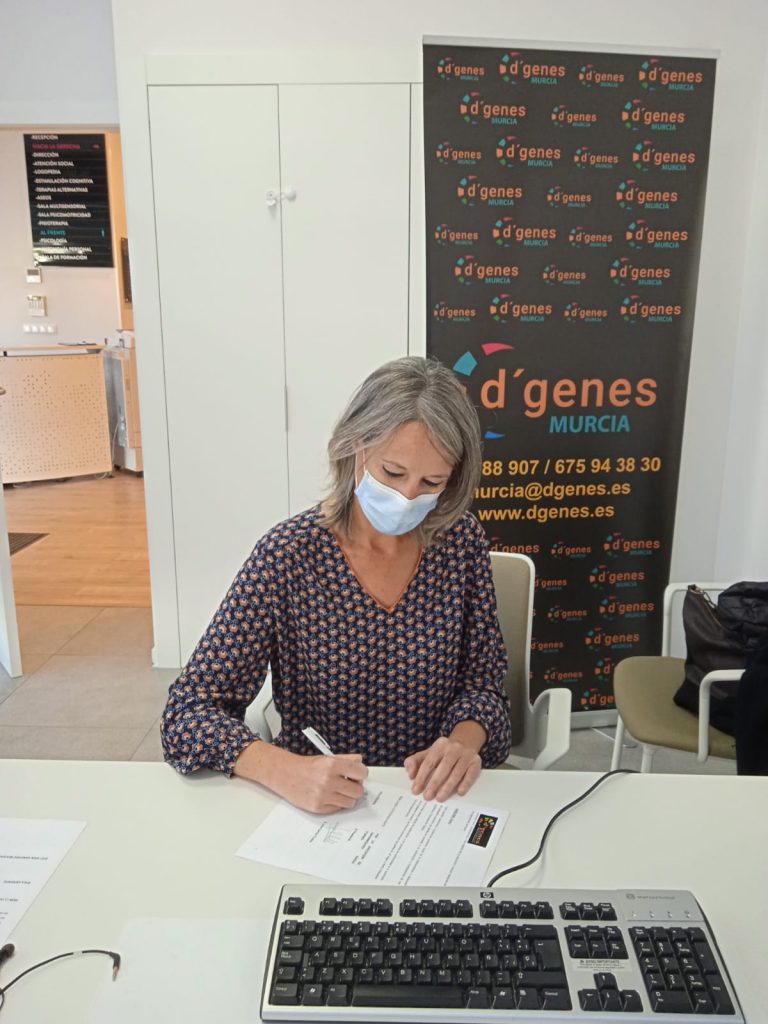La responsable del centro veterinario, Sira Sánchez molera, visitó el Centro Multidisciplinar de Atención integral a personas y familias con síndrome X Frágil y otras enfermedades raras «Pilar Bernal Giménez» de Murcia, donde suscribió el convenio, que contempla la aplicación de descuentos en servicios para Luna, el can que participa en el proyecto de Intervención asistida con perro que desarrolla D´Genes.