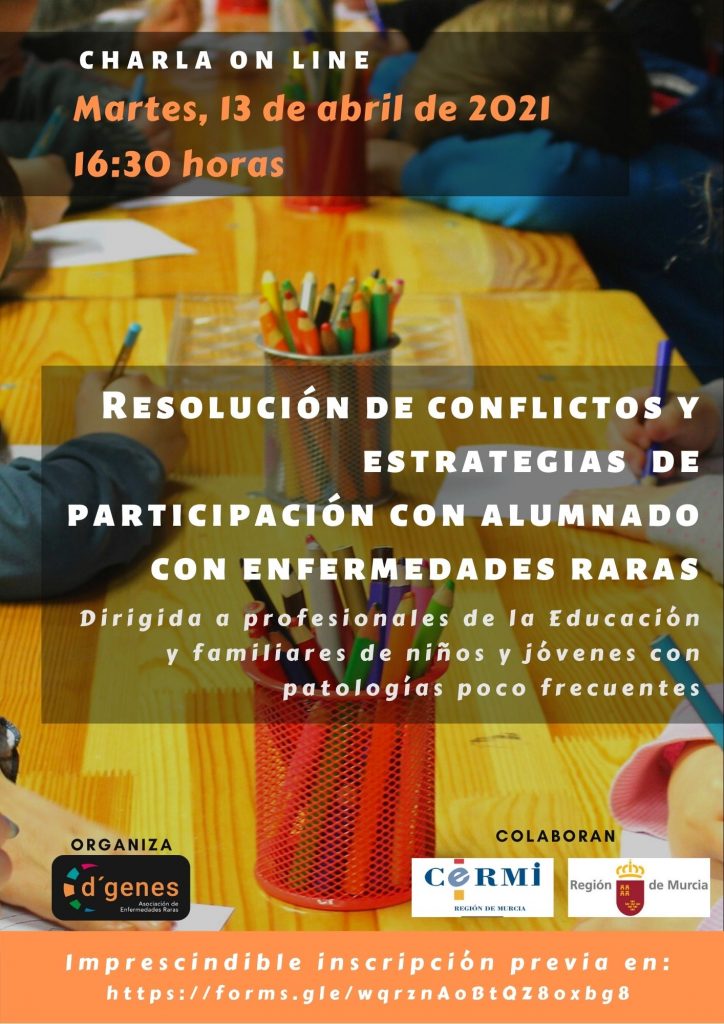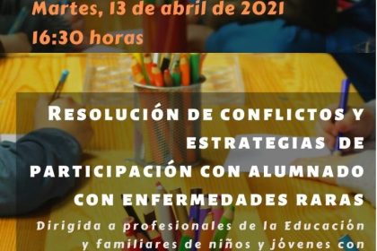 La Asociación de Enfermedades Raras D´Genes ha oranizado una charla sobre resolución de conflictos y estrategias de participación con alumnado con enfermedades raras, que tendrá lugar el próximo 13 de abril a las 16.30 horas de manera on line.