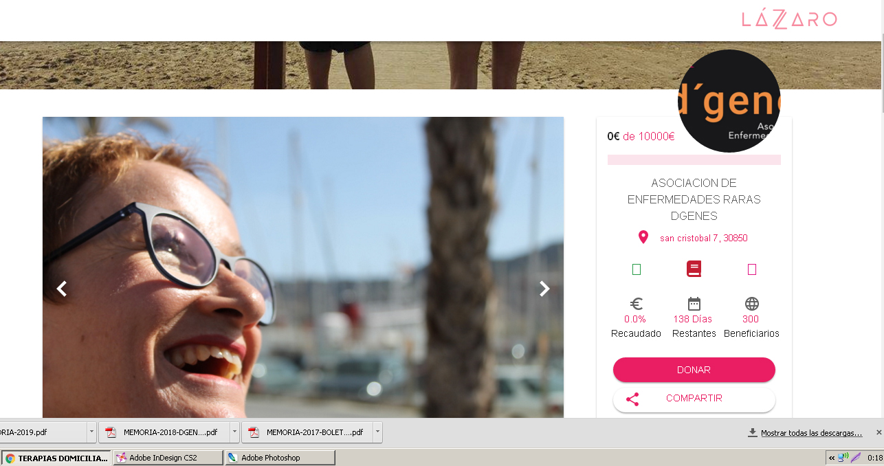 La Asociación de Enfermedades Raras D´Genes ha iniciado una campaña en la plataforma Lázzaro con el fin de recaudar fondos para el proyecto de Terapias domiciliarias a personas con enfermedades raras y sin diagnóstico por el COVID 19. Lázzaro es una plataforma de fundraising, es decir de recaudación de fondos, basada en tecnología blockchain, que permite a los donantes conocer las necesidades concretas del proyecto con el que van a colaborar.