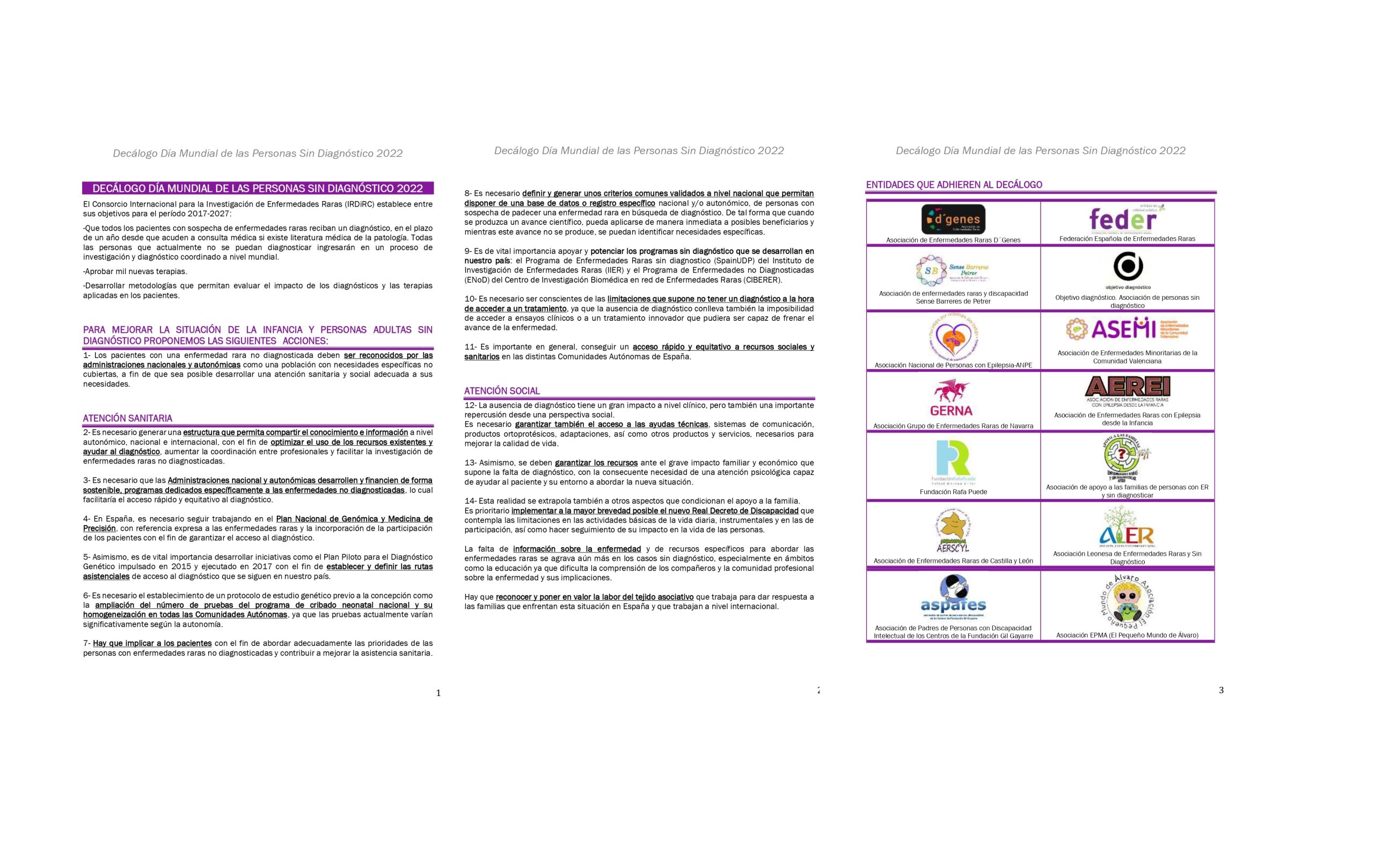 En este decálogo se plasman algunas de las principales necesidades en materia sanitaria y social de las personas y familias que conviven sin diagnóstico, entre ellas que los pacientes con una enfermedad rara no diagnosticada deben ser reconocidos por las administraciones nacionales y autonómicas como una población con necesidades específicas no cubiertas, a fin de que sea posible desarrollar una atención sanitaria y social adecuada a sus necesidades.