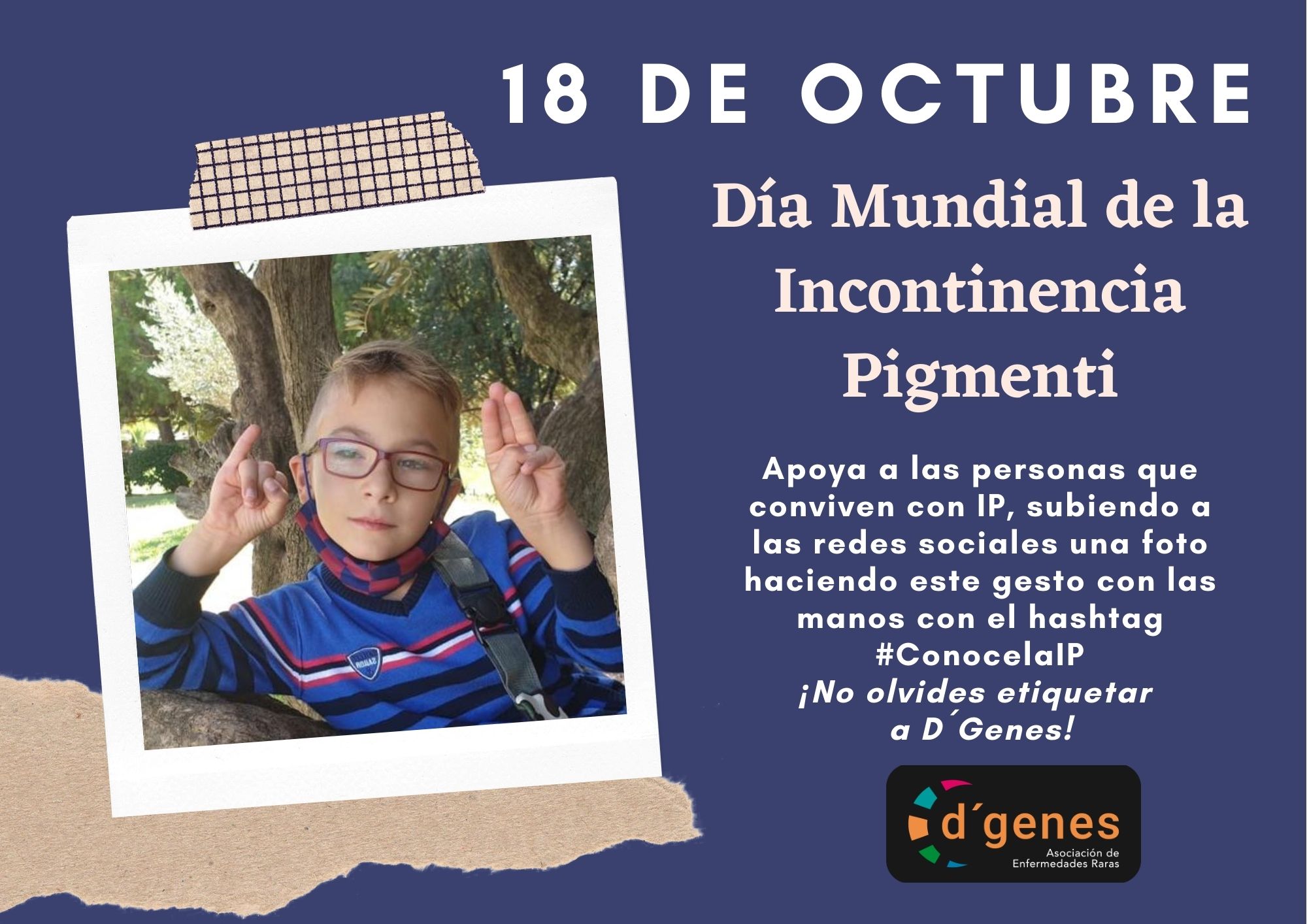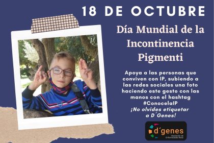 Con este simple gesto desde D´Genes, y en particular desde su grupo de trabajo D´Genes incontinencia Pigmenti, pretende dar difusión y visibilidad a esta patología, una enfermedad genética de la piel, cabello, dientes y sistema nervioso central.