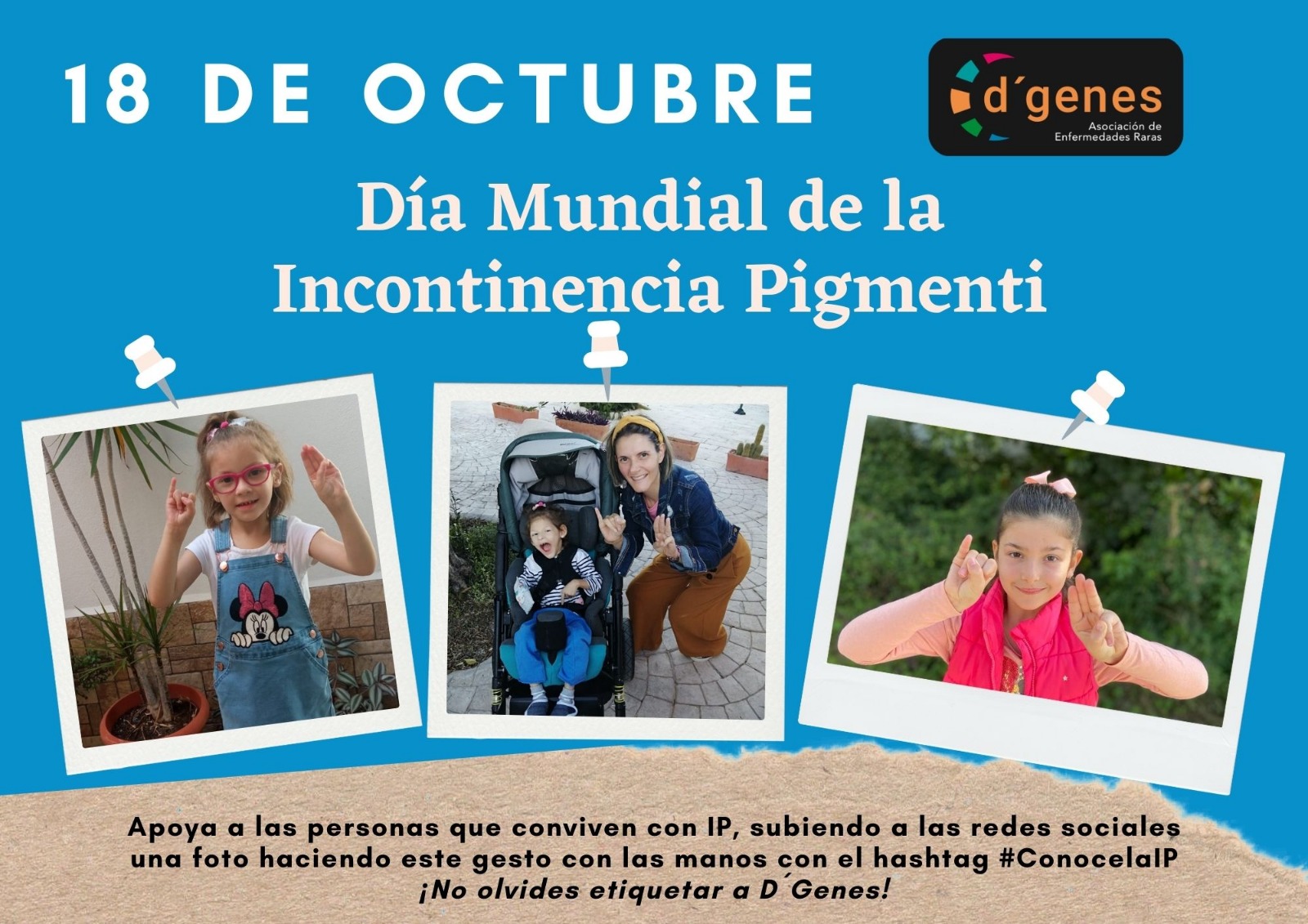 Desde D´Genes se anima en esta jornada a mostrar el apoyo a las personas que la padecen con un sencillo gesto: haciéndose una foto con las palmas mirando a la cámara con la mano derecha cerrando el puño y levantando sólo el dedo meñique y con la izquierda cerrando el puño y levantando los tres dedos centrales (anular, corazón e índice) y posteriormente compartiéndola en redes sociales con el hashgtag #ConocelaIP y etiquetando a D´Genes.