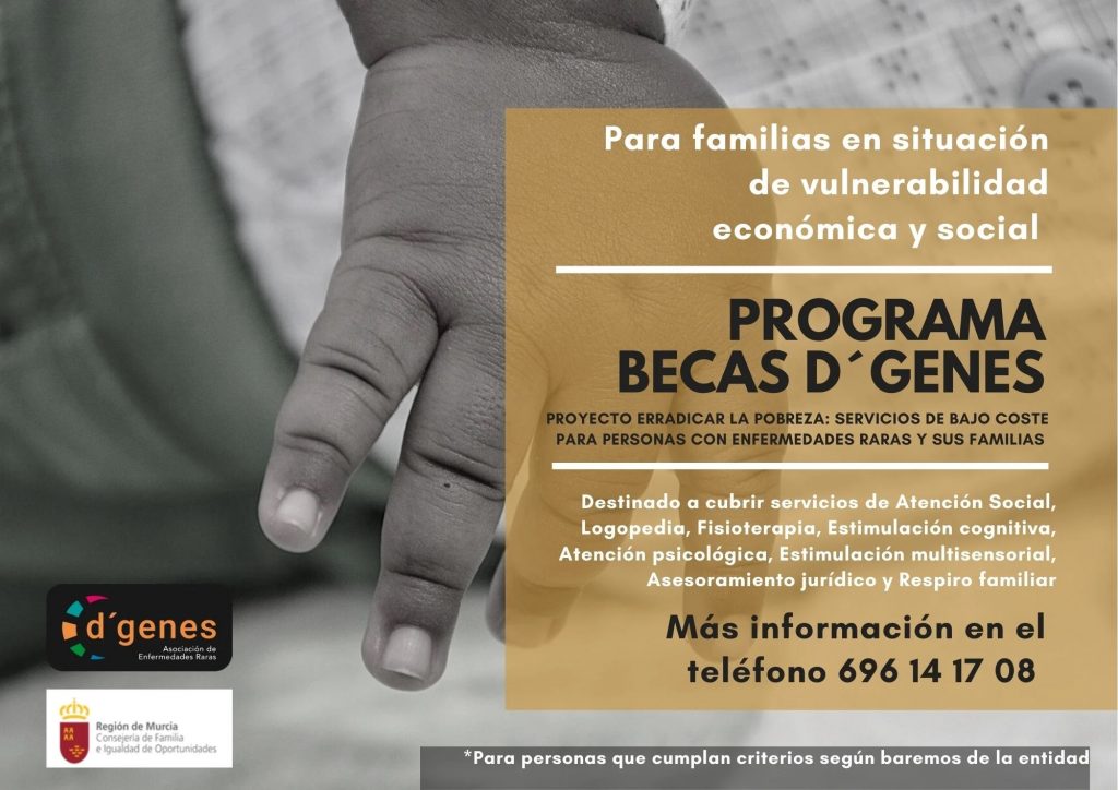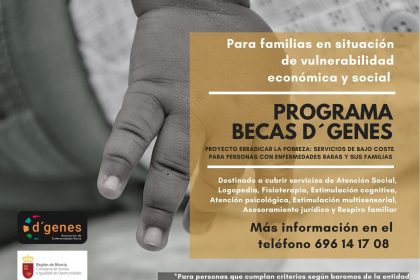 D´Genes pone a disposición su programa de becas en el marco del proyecto Erradicar la pobreza. servicios de bajo coste para personas con enfermedades raras y sus familias, gracias a la colaboración de la Consejería de Familia e Igualdad de oportunidades de la Comunidad Autónoma de la Región de Murcia, destinado a cubrir servicios de Atención Social, Logopedia, Fisioterapia, Estimulación cognitiva, Atención psicológica, Estimulación multisensorial, Asesoramiento jurídico y Respiro familiar.