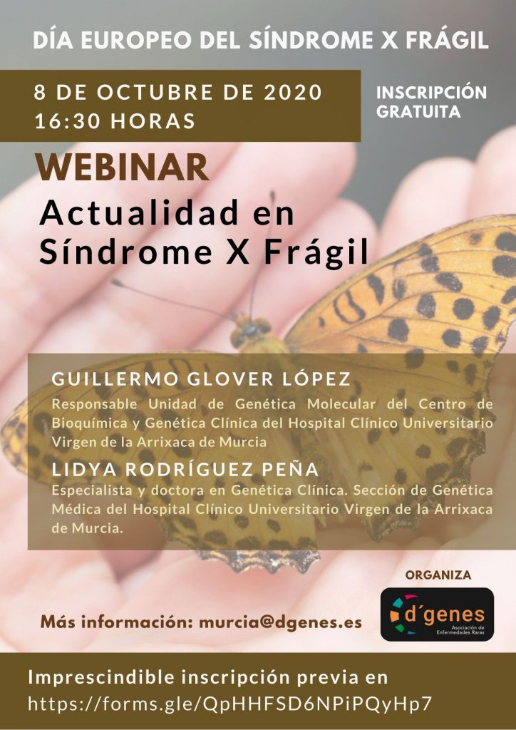 La sesión contará con la intervención del responsable de la Unidad de Genética Molecular del Centro de Bioquímica y Genética Clínica del Hospital Clínico Universitario Virgen de la Arrixaca de Murcia, Guillermo Glover López, que abordará actualizaciones en el Síndrome X Frágil. Asimismo, intervendrá la doctora Lidya Rodríguez Peña, especialista en Genética Clínica, que trabaja en asesoramiento genético en la Sección de Genética Médica del Hospital Clínico Universitario Virgen de la Arrixaca, y hablará durante su intervención de «Fallo ovárico precoz en portadoras de premutación de X Frágil. Asesoramiento genético y opciones reproductivas».