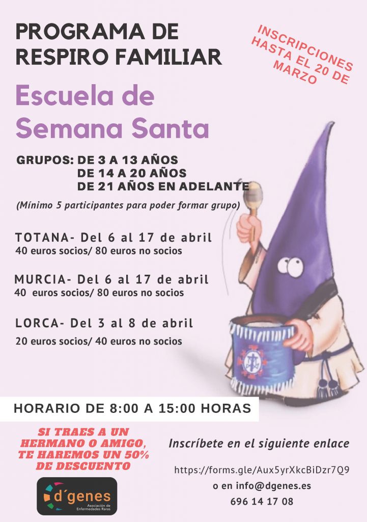 La Asociación de Enfermedades Raras D´Genes llevará a cabo una Escuela de Semana Santa en sus delegaciones de Totana, Murcia y Lorca, coincidiendo con las próximas vacaciones escolares.