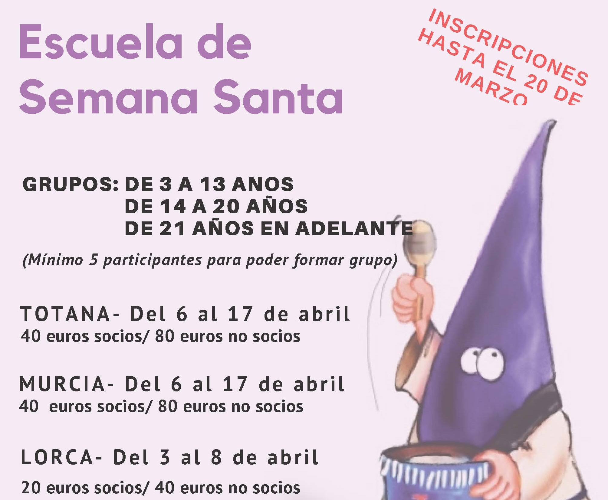 Los precios se han fijado atendiendo a los diferentes días de funcionamiento de la Escuela de Semana Santa en cada delegación, dado que cada municipio cuentan con un período propio de vacaciones escolares. En este sentido, en el caso de Totana y Murcia el precio se ha fijado en 40 euros para los socios de D´Genes y 80 los no socios, mientras que en Lorca los socios deberán abonar 20 euros y los no socios 40.