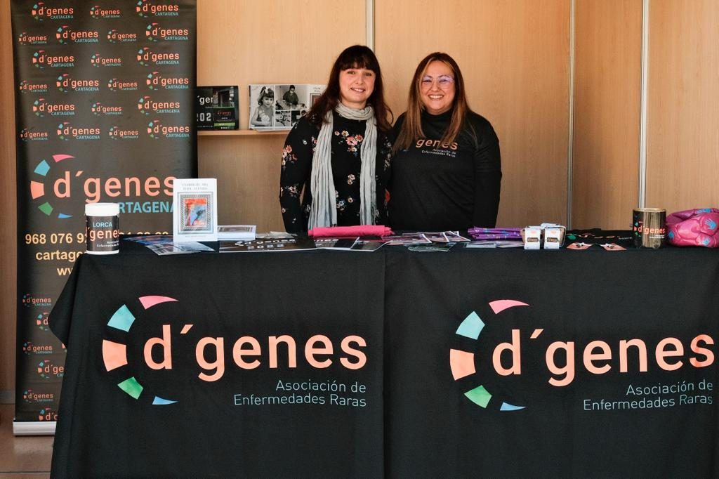 D´Genes ocupa uno de los expositores desde el que se ofrece información de la asociación y los servicios que presta para mejorar la calidad de vida de personas y familias que conviven con patologías poco frecuentes. La asociación cuenta con una delegación en Cartagena, en la que se prestan servicios de logopedia, estimulación cognitiva, respiro familiar y apoyo educativo, además de información y orientación.