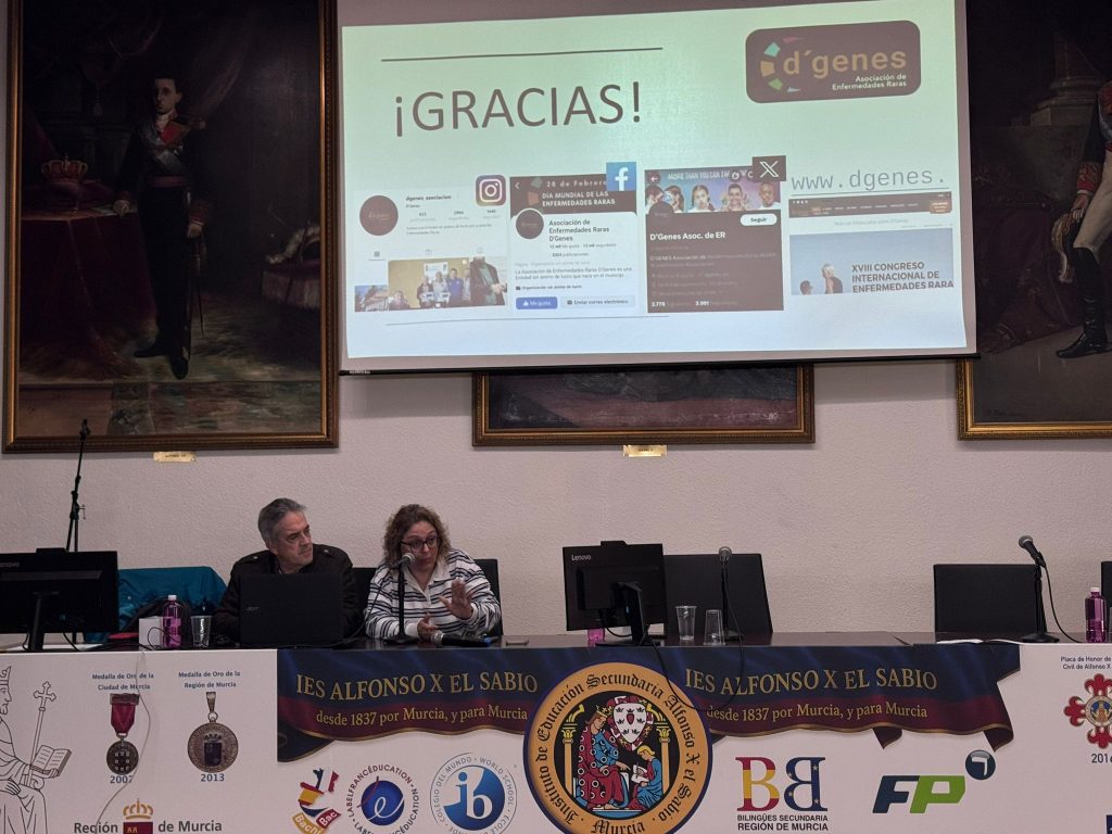 Desde D’Genes se quiere agradecer al IES Alfonso X de Murcia la invitación y su compromiso con la educación en valores, la promoción de la salud y la visibilización de la realidad de las personas con enfermedades raras.