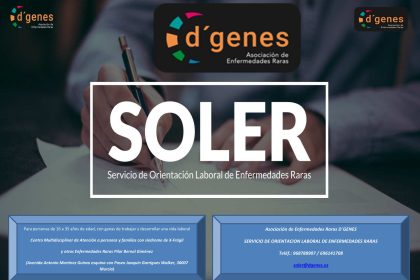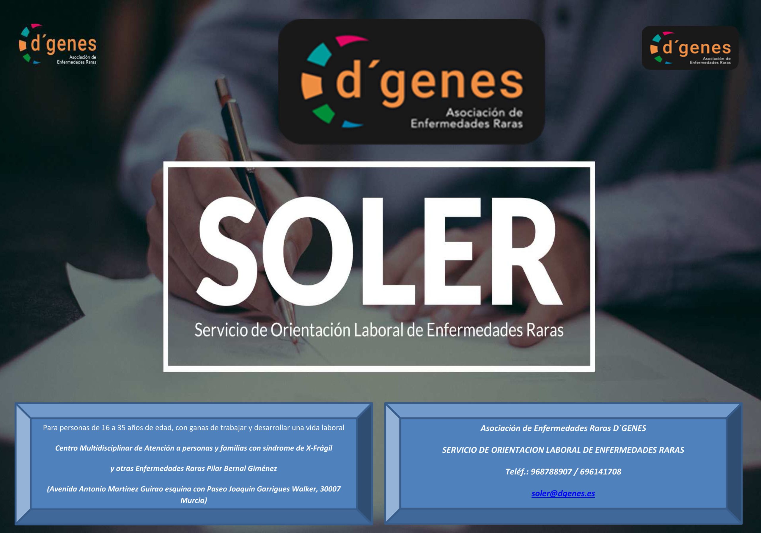 La Asociación de Enfermedades Raras D´Genes ha puesto en marcha en el Centro Multidisciplinar de Atención Integral a personas y familias con Síndrome X Frágil y otras enfermedades raras «Pilar Bernal Giménez» de Murcia el Servicio de Orientación Laboral de Enfermedades Raras (SOLER).