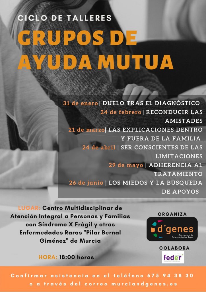 Todos los talleres tendrán lugar en el Centro Multidisciplinar de Atención Integral a Personas y Familias con Síndrome X Frágil y otras enfermedades raras «Pilar Bernal Giménez» de Murcia a las 18:00 horas. Los interesados en asistir deben confirmar su asistencia en el teléfono 675 94 38 30 o a través del correo [email protected]. Este ciclo de talleres enmarcado en el proyecto de Grupos de Ayuda Mutua de D´Genes cuenta con la colaboración de la Federación Española de Enfermedades Raras (FEDER).