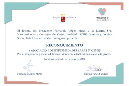 La Asociación de Enfermedades Raras D´Genes ha recibido el diploma acreditativo de su adhesión a la iniciativa Empresas por una sociedad libre de Violencia de Género.