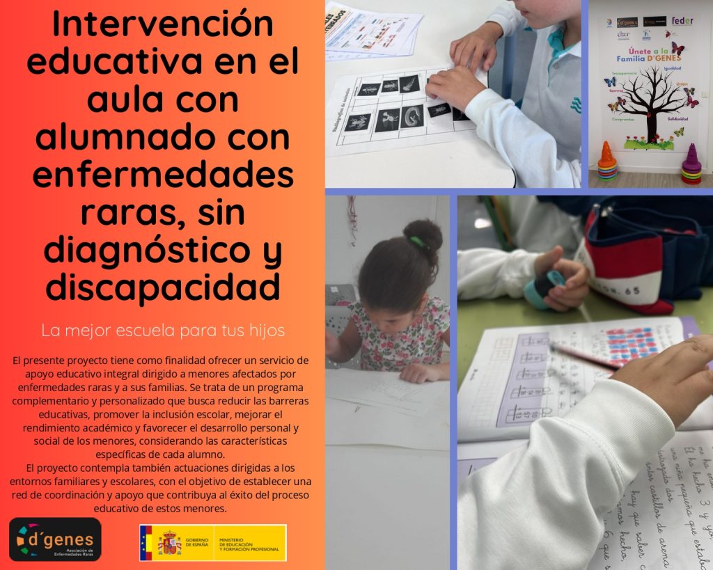 La Asociación de Enfermedades Raras D´Genes ha puesto en marcha un curso más su proyecto de Intervención educativa en el aula con alumnado con enfermedades raras, sin diagnóstico y discapacidad en la Región de Murcia, que tiene como finalidad ofrecer un servicio de apoyo educativo integral dirigido a menores afectados por enfermedades raras y a sus familias. Se trata de un programa complementario y personalizado que busca reducir las barreras educativas, promover la inclusión escolar, mejorar el rendimiento académico y favorecer el desarrollo personal y social de los menores, considerando las características específicas de cada alumno.