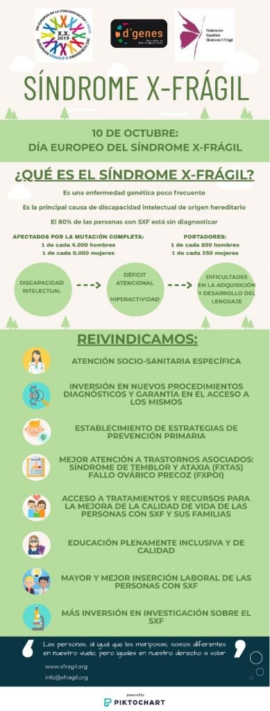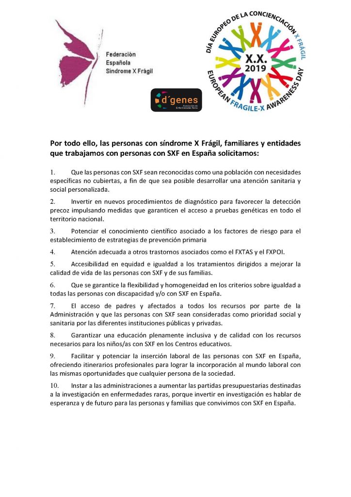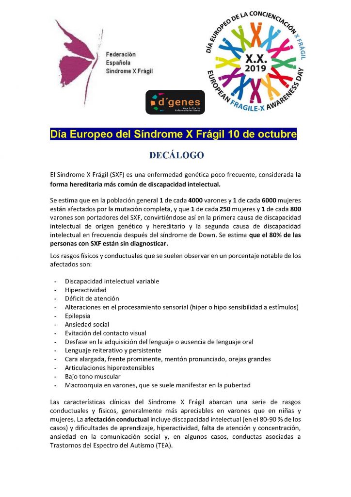 En esta jornada D´Genes apoya las reivindicaciones de las personas con SXF, familias y entidades que trabajan con personas con esta patología y se suma a dar visibilidad al Síndrome X Frágil difundiendo el Decálogo que recoge las principales propuestas y necesidades.