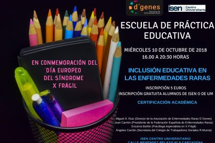 La Asociación de Enfermedades Raras D´Genes y el Centro Universitario ISEN de Cartagena han organizado una Escuela de práctica educativa sobre Inclusión educativa en las enfermedades raras que tendrá lugar el próximo 10 de octubre de 16:00 a 20:30 horas, coincidiendo con la conmemoración del Día Europeo del Síndrome X Frágil.