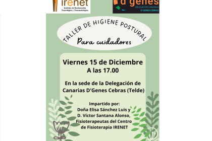 La sede de la delegación D´Genes Cebras Canarias, ubicada en Telde, acogerá el próximo 15 de diciembre un Taller de Higiene postural para cuidadores, impartido por el Instituto de Reeducación Neurológica y Traumatológica (IRENET).
