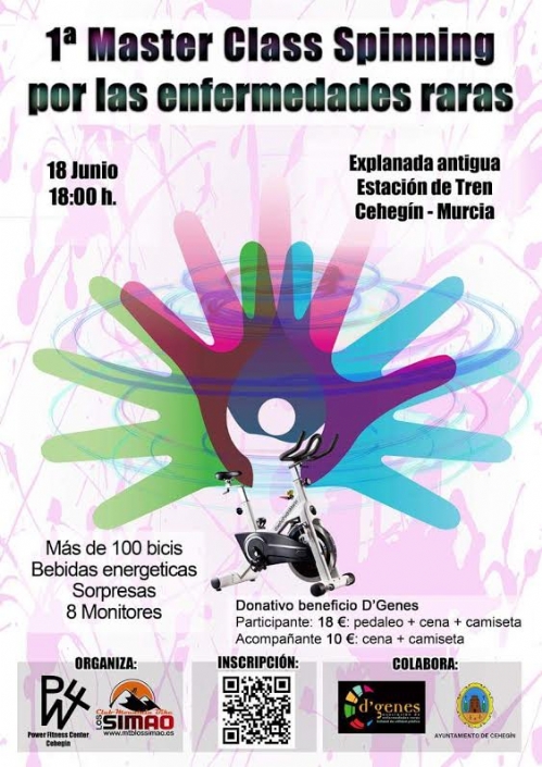 El próximo 18 de junio se celebrará la I Master Class Spinning por las Enfermedades Raras en Cehegín, que está organizada por el gimnasio Power Fitness Center y el Club MTB Los Simao y cuenta con la colaboración de la Delegación Noroeste de la Asociación de Enfermedades Raras D´Genes y la Concejalía de Deportes del Ayuntamiento de Cehegín.