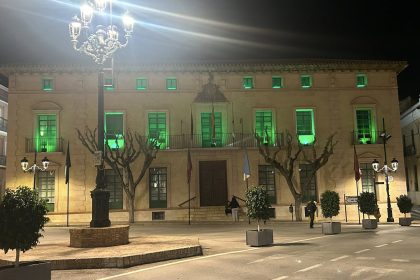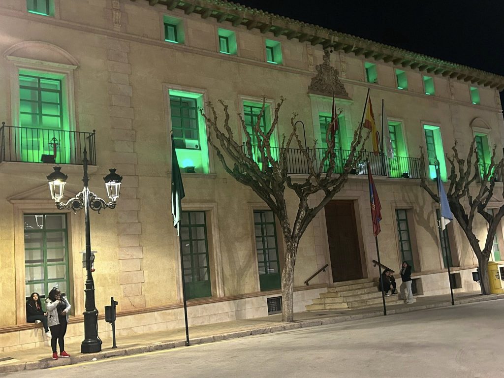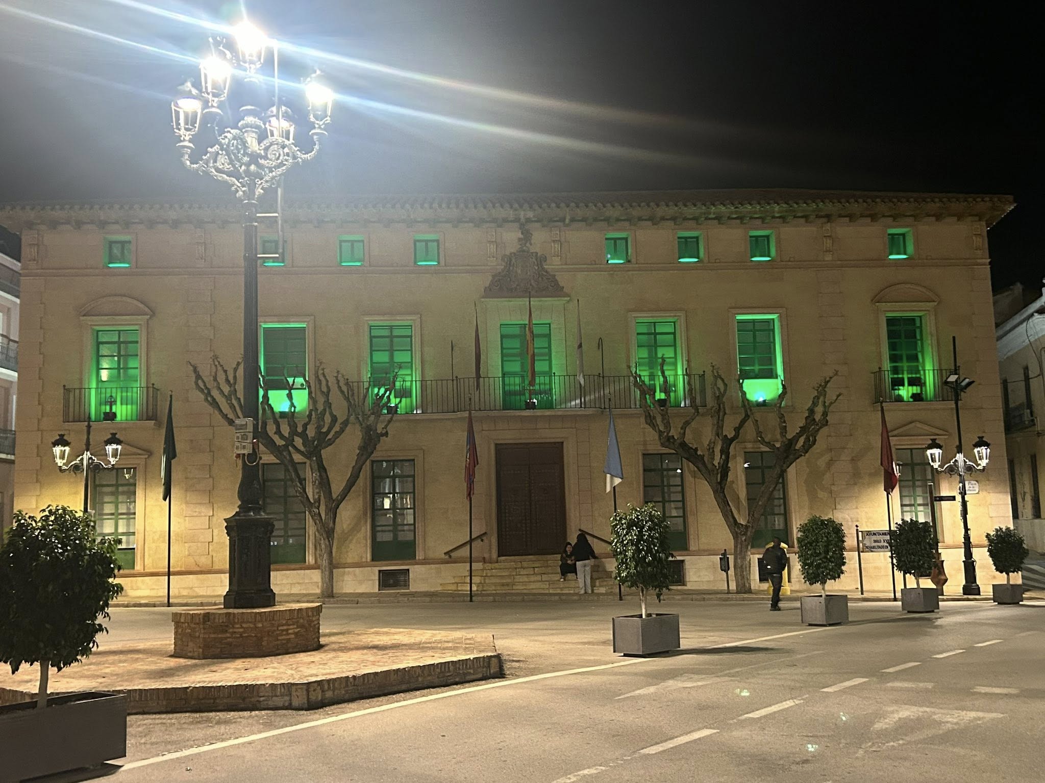 La fachada principal del Ayuntamiento de Totana se iluminó durante los días 28 de febrero y 1 de marzo de color verde para conmemorar el Día Mundial de las Enfermedades Raras y visibilizar la realidad social y sanitaria de estos pacientes y sus familias.