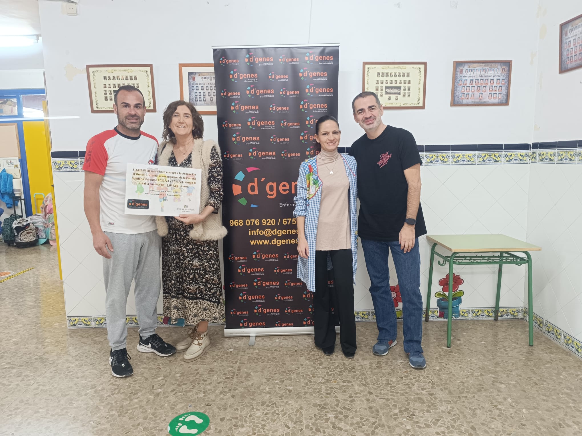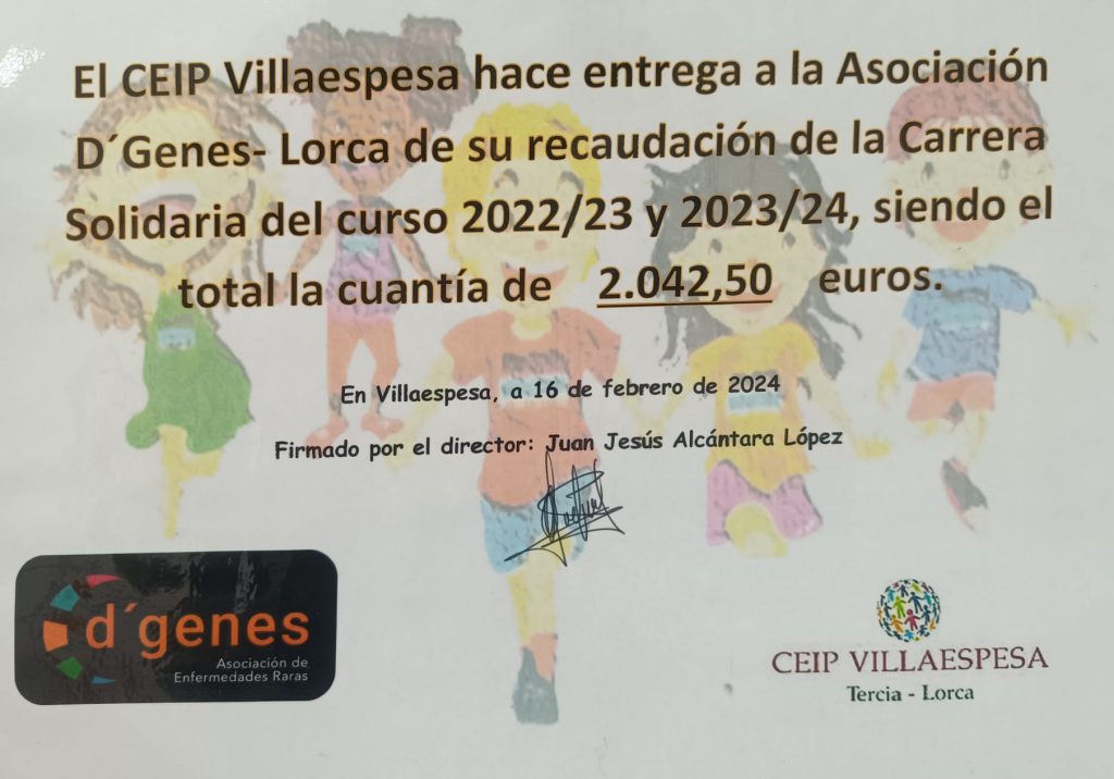 EL CEIP Villaespesa de la pedanía lorquina de Tercia ha hecho entrega a la Asociación de Enfermedades Raras D´Genes de un total de 2.042,50 euros, recaudados en la Carrera Solidaria de los cursos 2022-23 y 20023-24 que el centro educativo celebra en el marco del Día de la Paz y la No violencia.