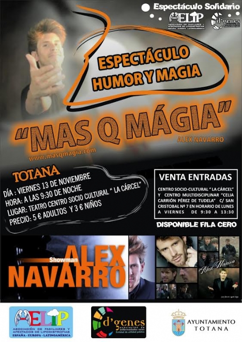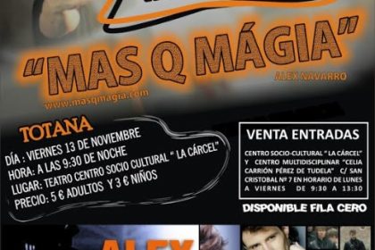El espectáculo “Más que magia” de Alex Navarro tendrá lugar en el Teatro del Centro Sociocultural “La Cárcel” este próximo viernes 13 de noviembre a partir de las 21.30 horas. Los beneficios del mismo se destinarán a D´Genes y AELIP. El precio de la entrada para asistir a este espectáculo es de 5 euros para los adultos y 3 euros para los niños, y además se ha dispuesto una fila cero para todo aquel que quiera colaborar.