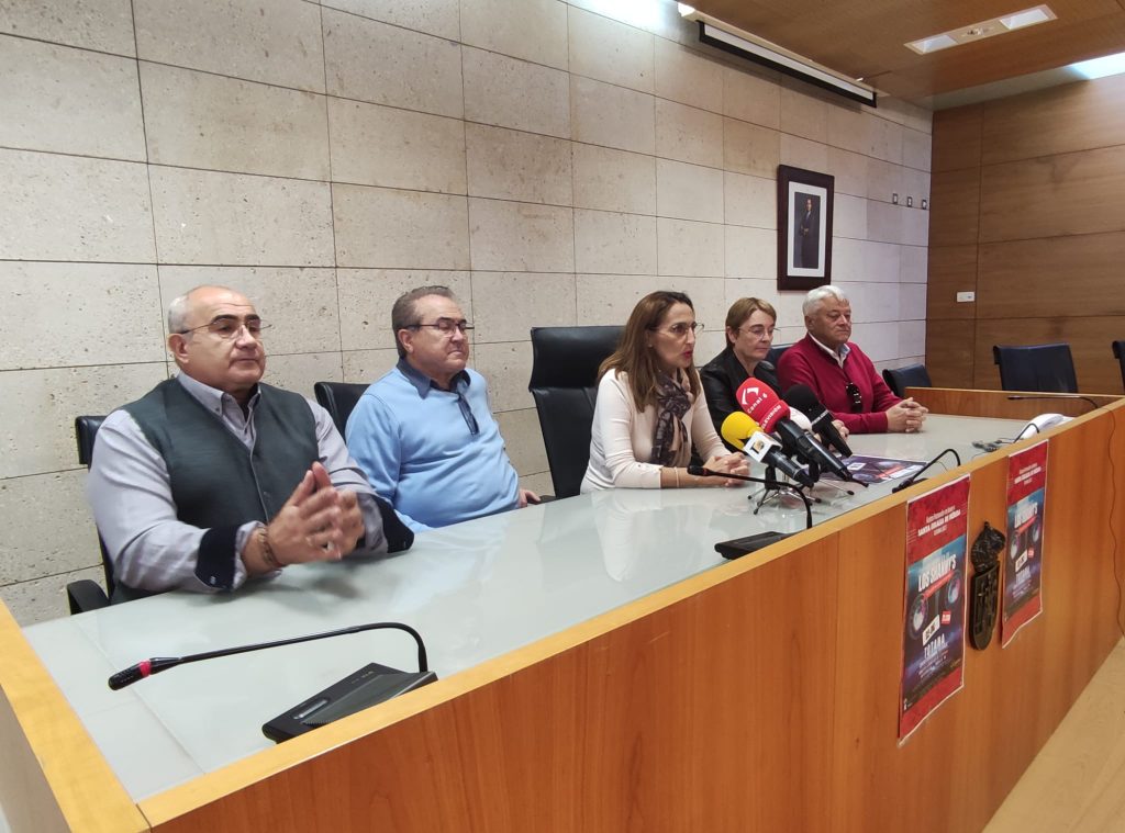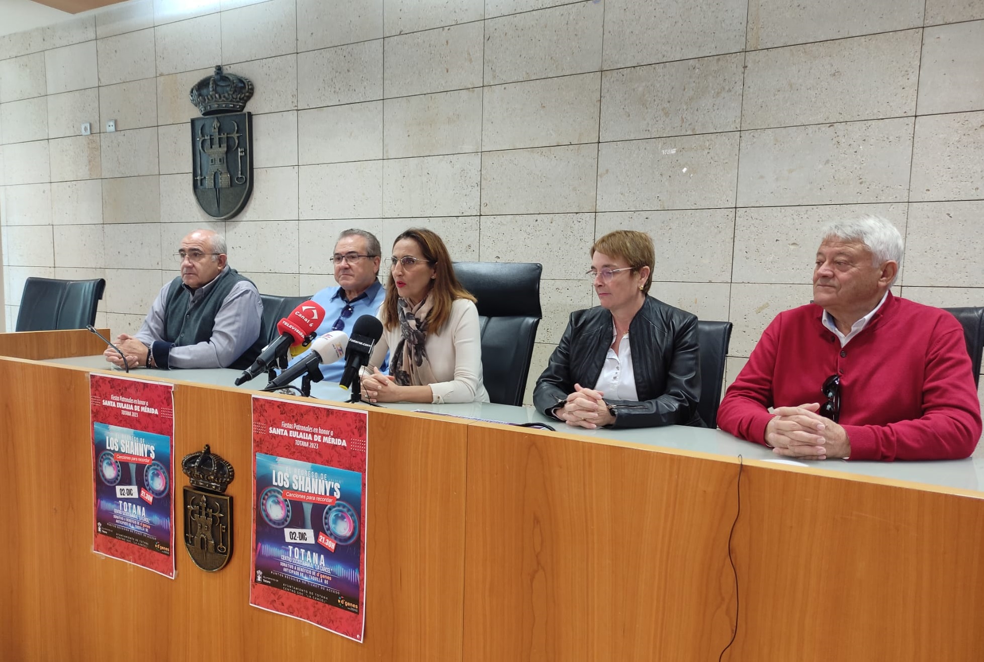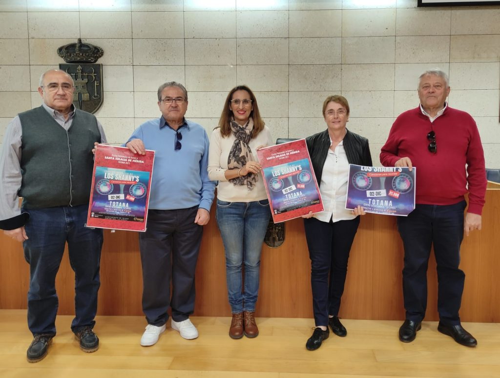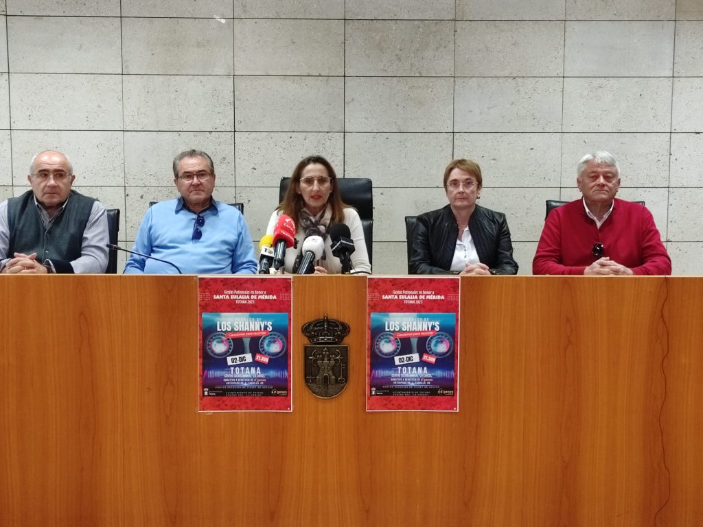 Tres de los componentes de Los Shanny´s, Miguel, Andrés y José, acompañados por la vicepresidenta de D´Genes Carmen Moreno y la concejal de Cultura y Festejos, Maribel Rubio, han presentado este concierto, que se enmarca en el programa de actos festivos en honor a la patrona de Totana, Santa Eulalia de Mérida.