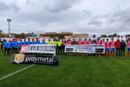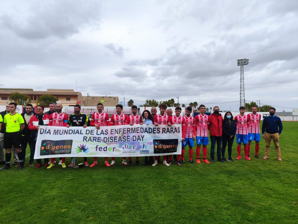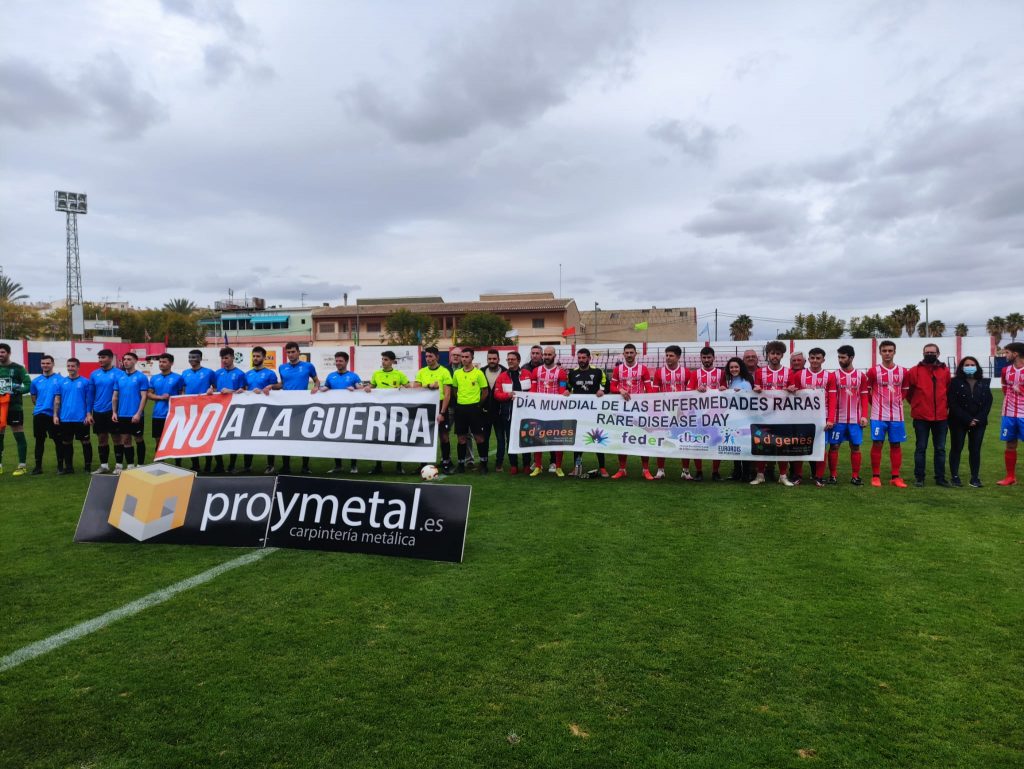 Minutos antes del inicio del encuentro disputado en el campo municipal Juan Cayuela, los jugadores de ambos equipos y el trío arbitral han posado juntos exhibiendo una pancarta del Día Mundial de las Enfermedades Raras. A la fotografía se han sumado también el presidente de la Asociación de Enfermedades Raras D´Genes, Juan Carrión, y otros miembros de la asociación.