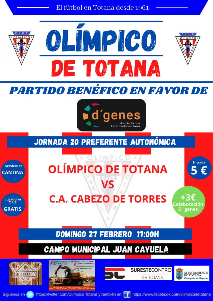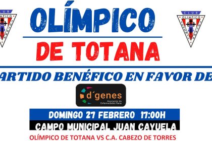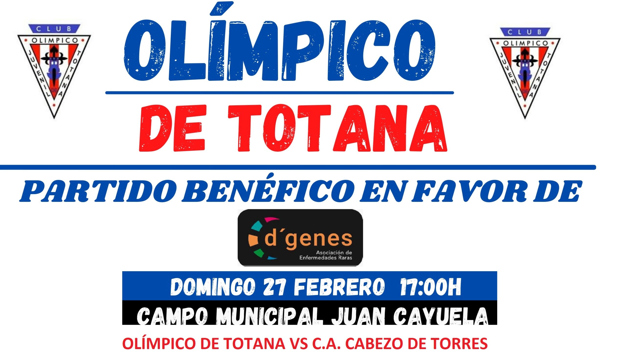 El Olímpico de Totana se suma a dar visibilidad al Día Mundial de las Enfermedades Raras, que se conmemora el 28 de febrero. El club totanero ha querido mostrar su cara más solidaria y ha decidido que el próximo partido que jugará el equipo en el campo municipal «Juan Cayuela» el domingo 27 de febrero a las 17:00 horas frente al C.A. Cabezo de Torres tenga carácter benéfico a favor de la Asociación de Enfermedades Raras D´Genes.