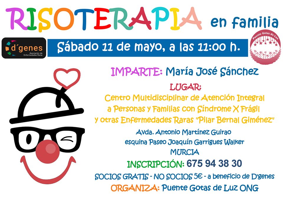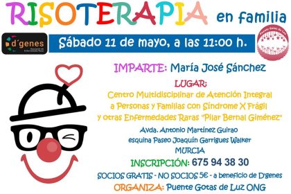 El próximo sábado, 11 de mayo, tendrá lugar una sesión de Risoterapia en familia en el Centro Multidisciplinar de Atención Integral a personas y familias con Síndrome X Frágil y otras enfermedades raras «Pilar Bernal Giménez» de Murcia.