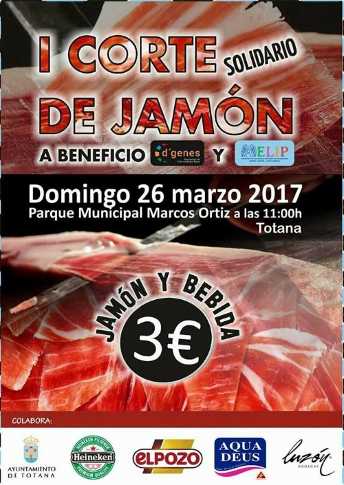 El próximo domingo 26 de marzo el Parque Municipal Marcos Ortiz de Totana acogerá una sabrosa a la par que solidaria actividad. Y es que ese día tendrá lugar el I Corte Solidario de Jamón a beneficio de la Asociación de Enfermedades Raras D´Genes y la Asociación de Familiares y Afectados de Lipodistrofias (AELIP).