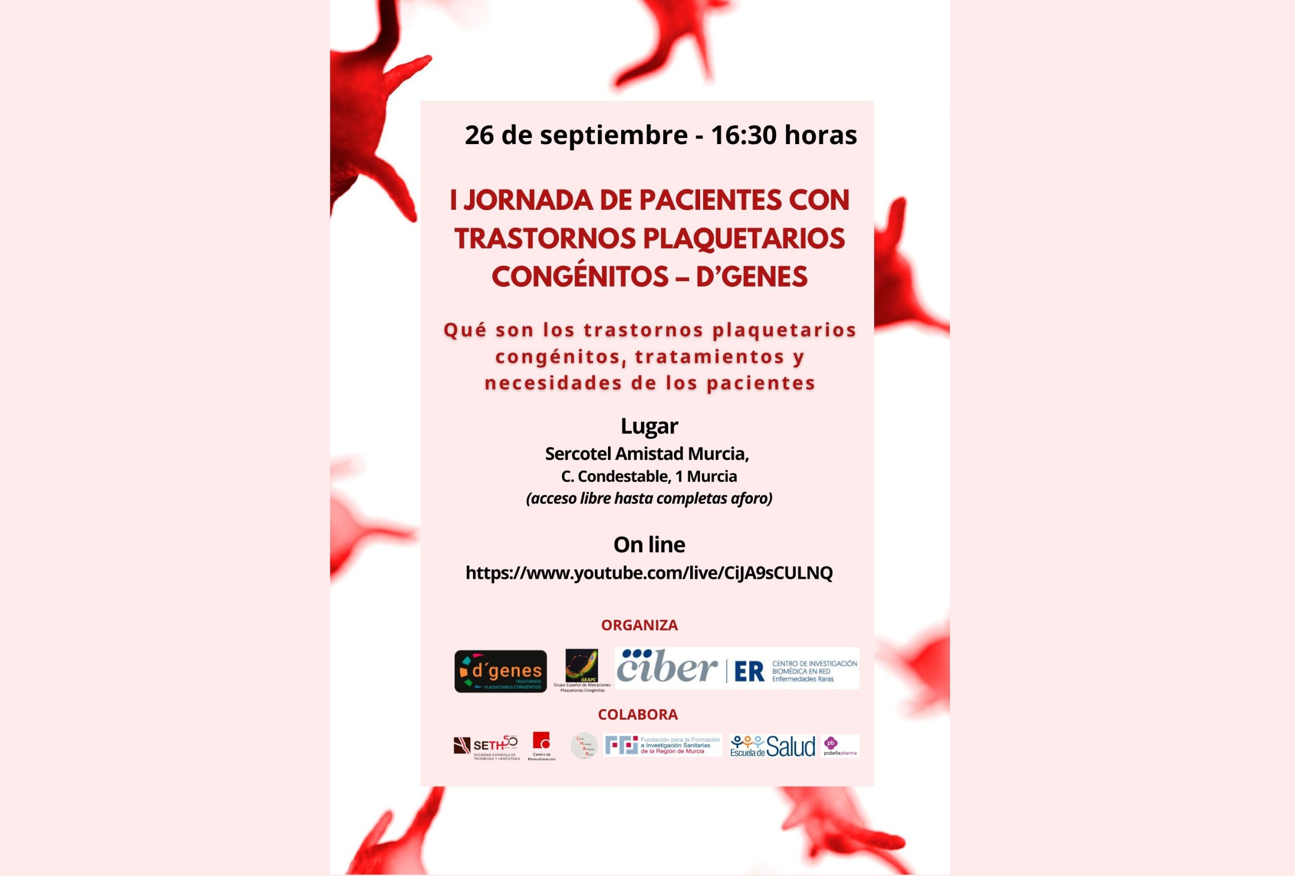 El próximo 26 de septiembre se celebrará en Murcia la I Jornada de Pacientes con Trastornos Plaquetarios Congénitos – D´Genes, que se podrá seguir también de manera on line