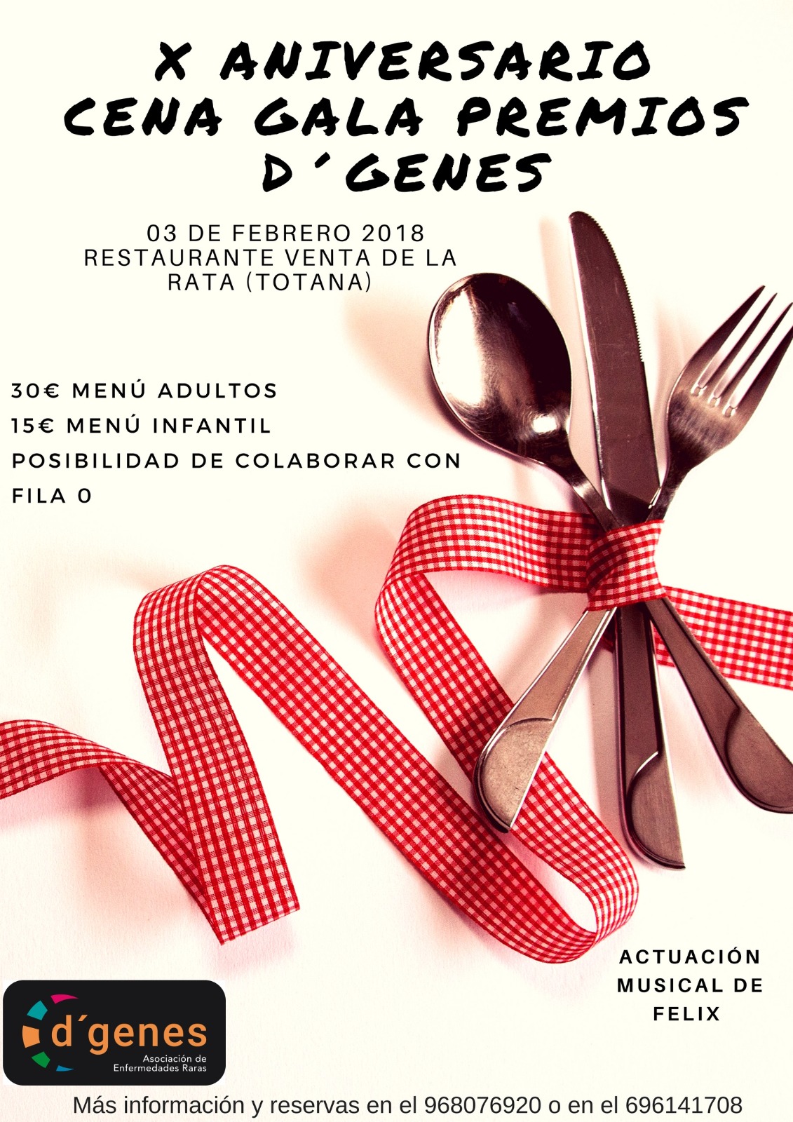 El próximo 3 de febrero se celebrará la Cena Gala Premios D´Genes, que este año además celebra su décimo aniversario. Durante la misma se entregarán distinciones a personas, empresas, colectivos o instituciones que han aportado su granito de arena para mejorar la calidad de vida del colectivo de personas con enfermedades raras o han colaborado y contribuido a difundir la realidad del mismo.