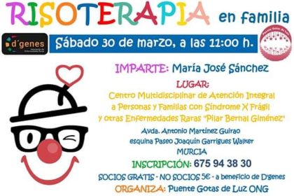 El Centro Multidisciplinar de Atención Integral a Personas y Familias con Síndrome X Frágil y otras enfermedades raras «Pilar Bernal Giménez» ubicado en Murcia, acogerá el próximo 30 de marzo un taller de risoterapia en familia organizado por Puente Gotas de Luz ONG e impartido por María José Sánchez.