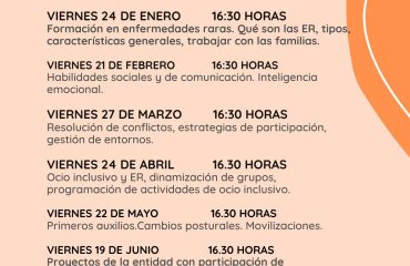 Las reuniones tendrán lugar a las 17:00 horas de manera presencial en el Centro Multidisciplinar de atención integral a personas y familias con síndrome X Frágil y otras enfermedades raras «Pilar Bernal Giménez». Los interesados en asistir deben confirmar asistencia en el teléfono 675 94 38 30 o bien a través del correo [email protected].