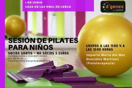 Todavía quedan plazas para la actividad de pilates para niños que la delegación en Lorca de la Asociación de Enfermedades Raras D´Genes ha organizado el próximo 1 de junio. Tendrá lugar en la Casa de las ONGs de este municipio, impartida por la fisioterapeuta María del Mar González Martínez.